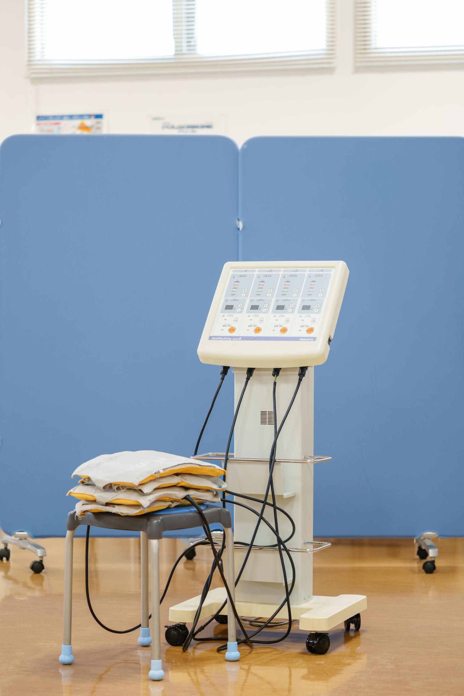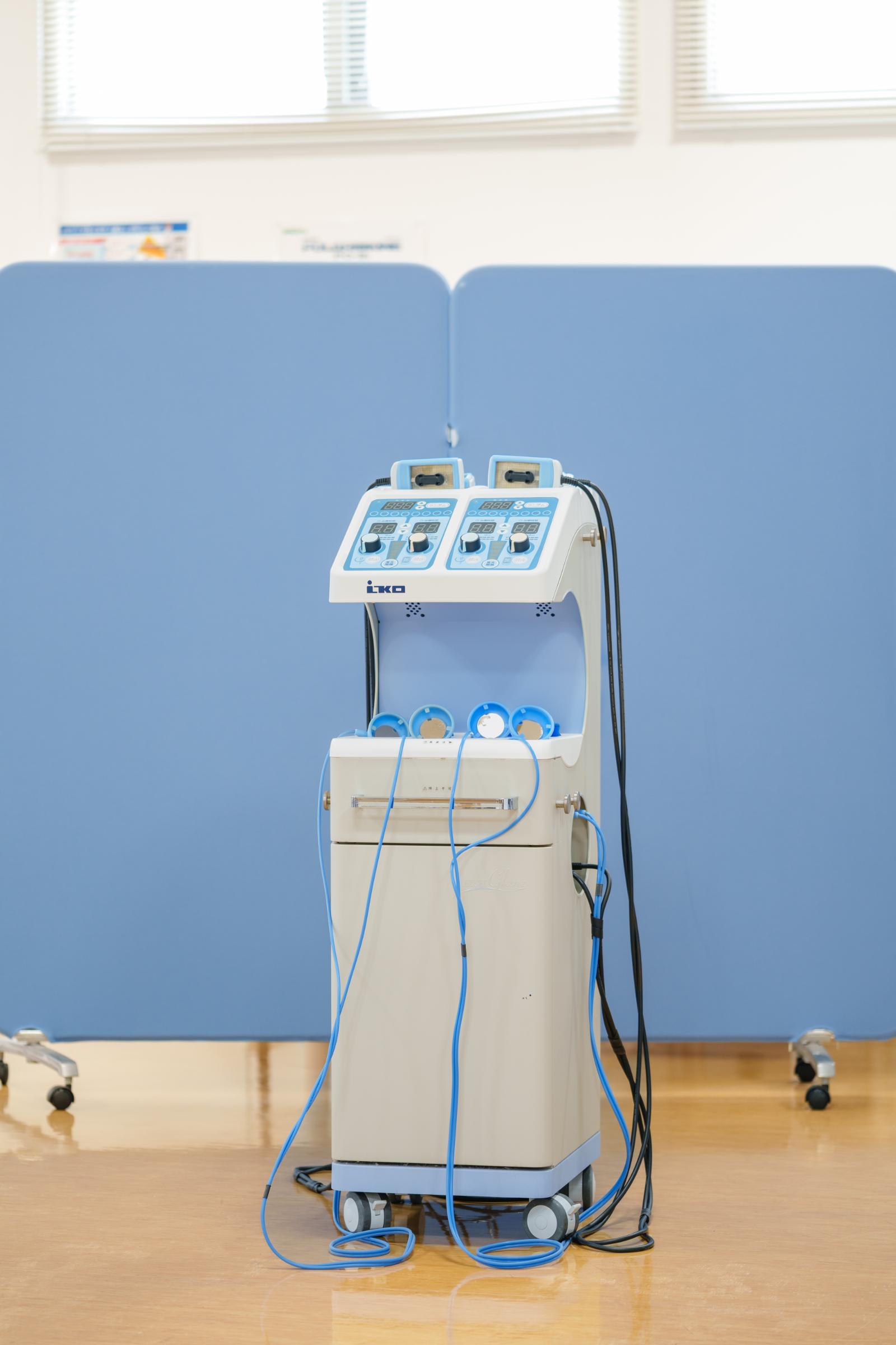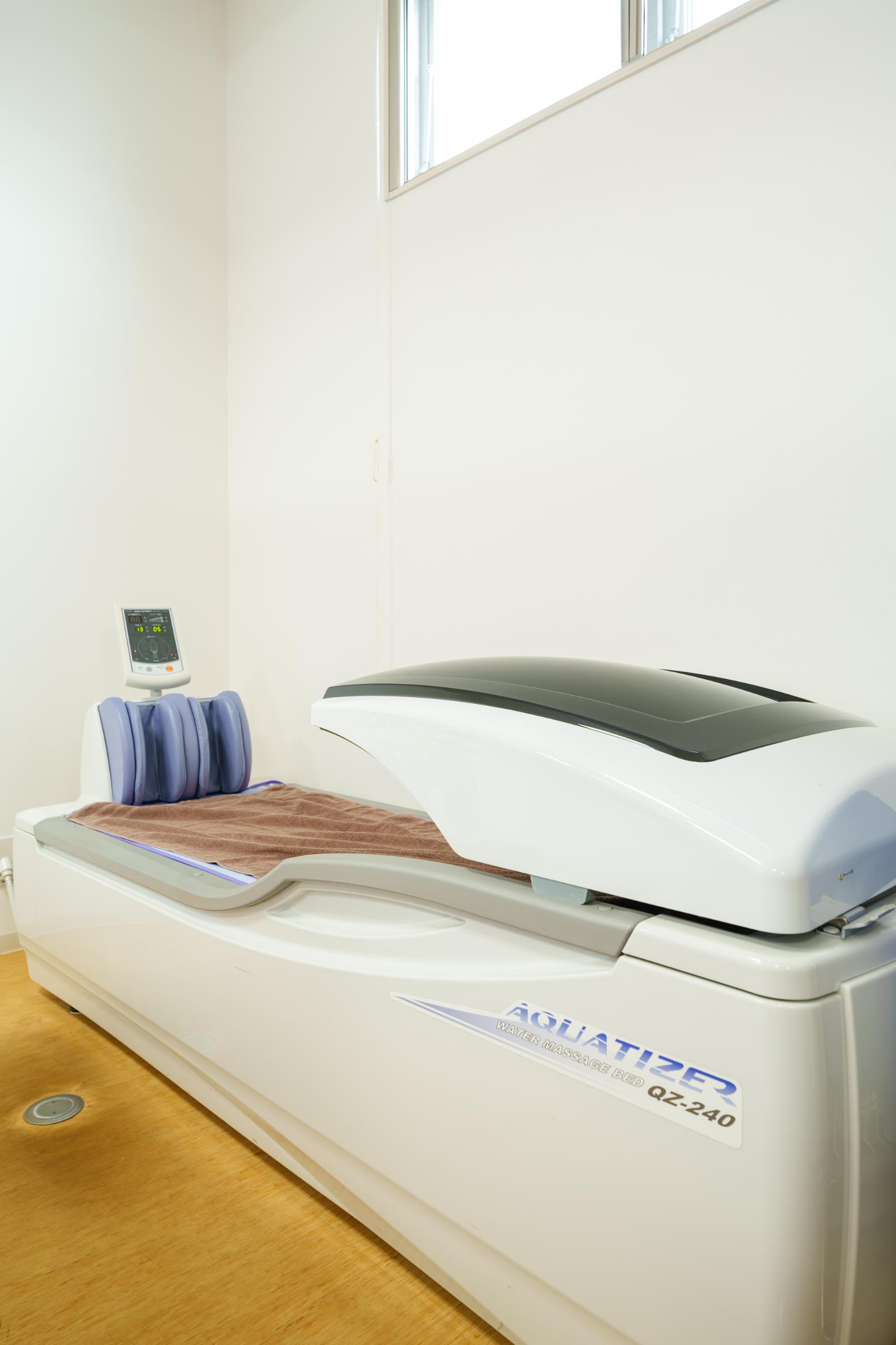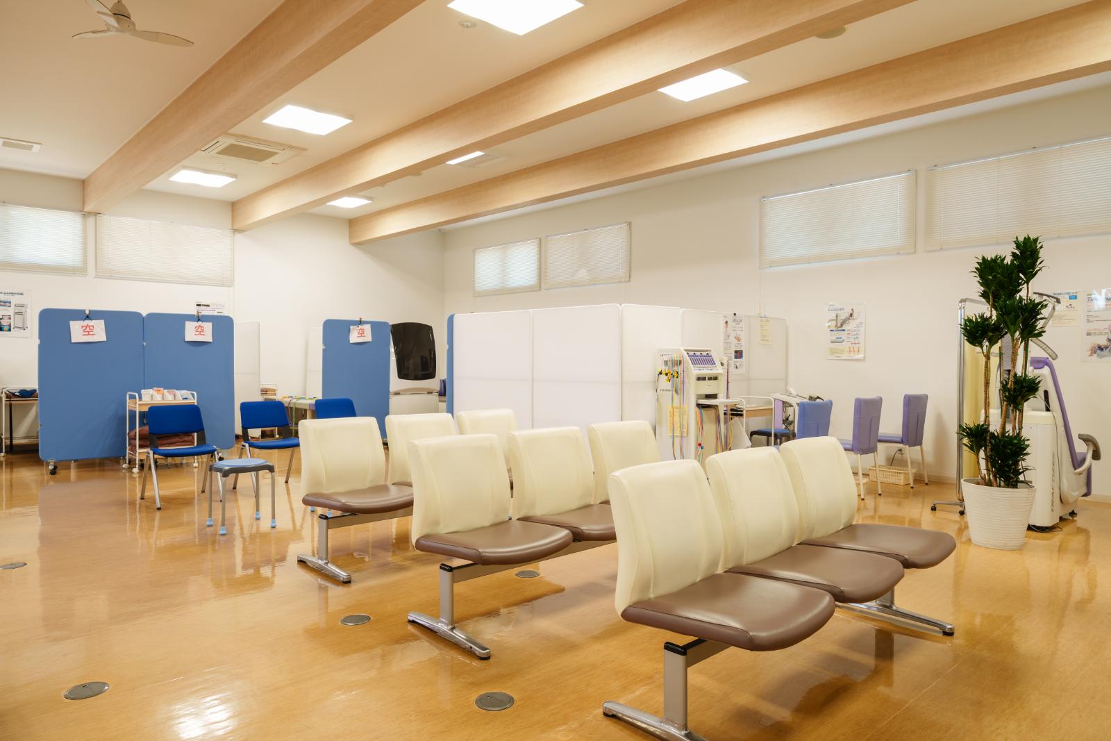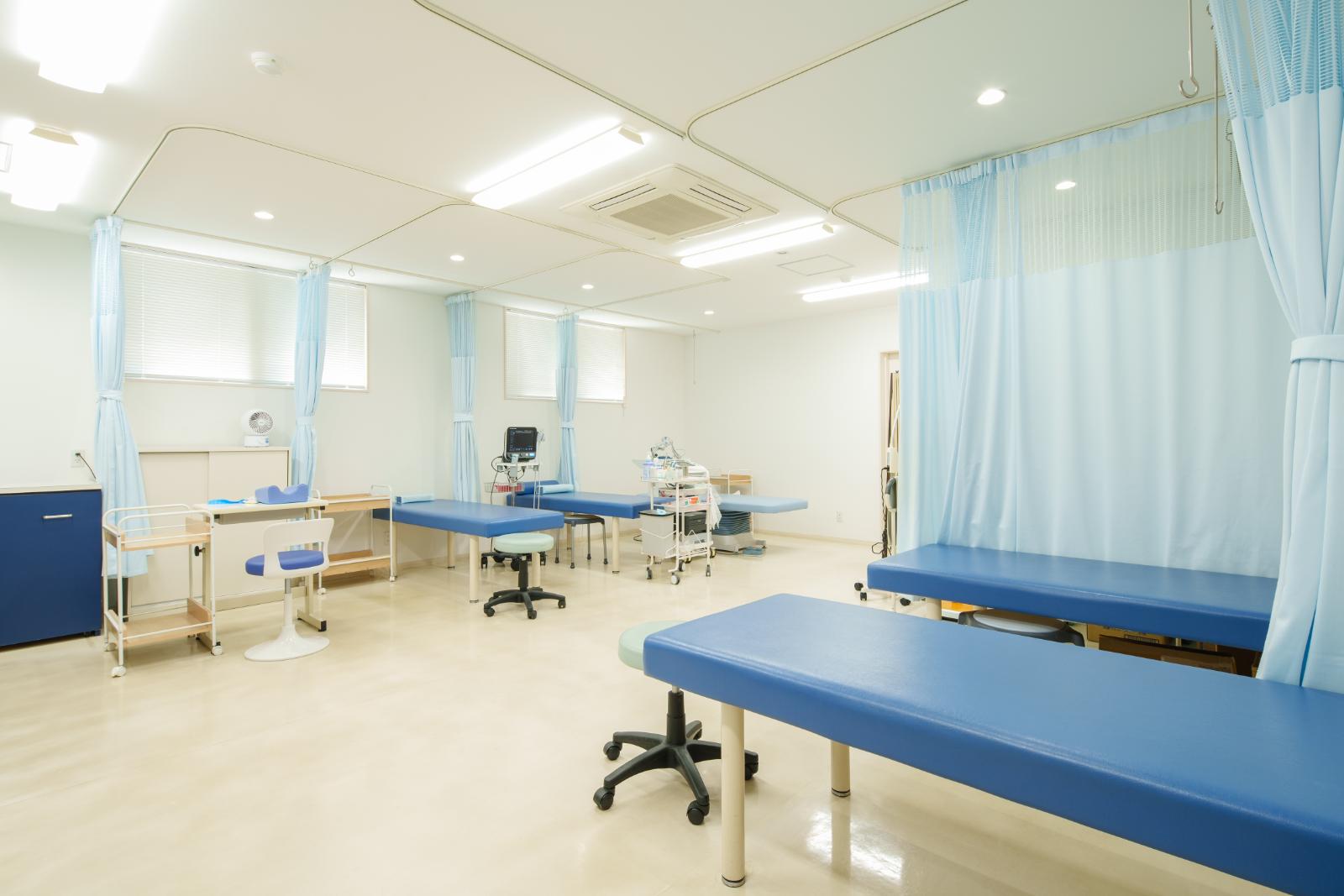 広いリハ室で各種電気治療、全身マッサージ効果のあるウォーターベッド、個別で行う運動器リハビリテーションを行います。